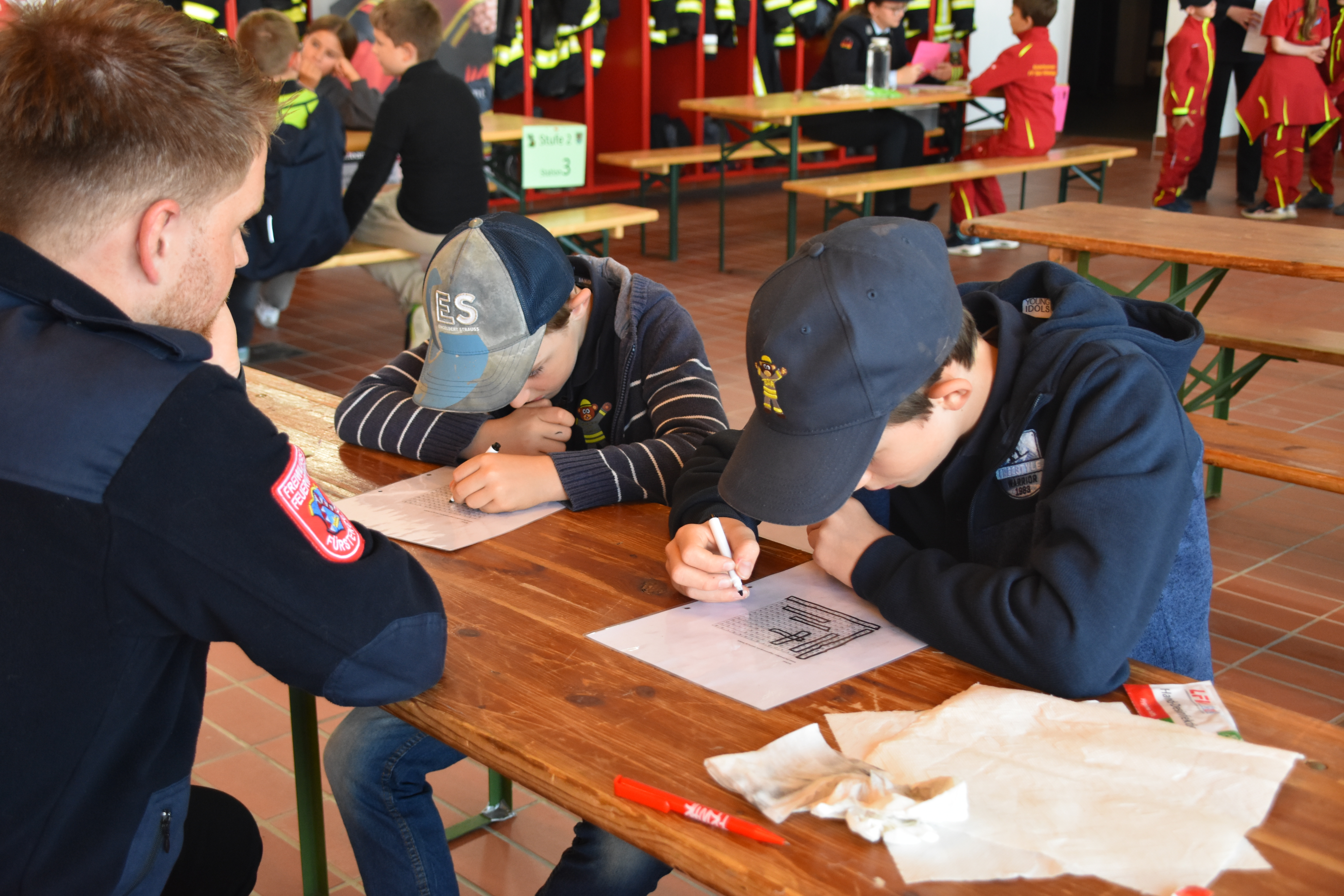 In den Leistungsstufen 1 und 2 gab es jeweils sechs Aufgaben zu bewältigen, in der Leistungsstufe 3 waren es deren fünf – aus den Themengebieten „Grundwissen Feuerwehr“, „Verhalten im Notfall“, „Richtiger Umgang mit Feuer“, „Truppaufgaben“ sowie den „Grundlagen in Erster Hilfe“, mit steigendem Schwierigkeitsgrad. Die Kinder sortierten aus, was nicht zur Schutzausrüstung eines Feuerwehrmanns gehört. Sie zeigten, wie man geschickt in 30 Sekunden Schnürsenkel (Knotenkunde) bindet. Ohne Probleme konnten sie brennbare von nicht brennbaren Stoffen unterscheiden und viele Geräte der Feuerwehr richtig benennen. Das Beachten der fünf W-Fragen beim Absetzen eines Notrufs stellte ebenso wenig eine Schwierigkeit dar wie die Anforderungen aus der Ersten Hilfe, vom Anlegen eines Fingerkuppenverbands über einen Druckverband bis hin zu den richtigen Griffen bei einer stabilen Seitenlage.