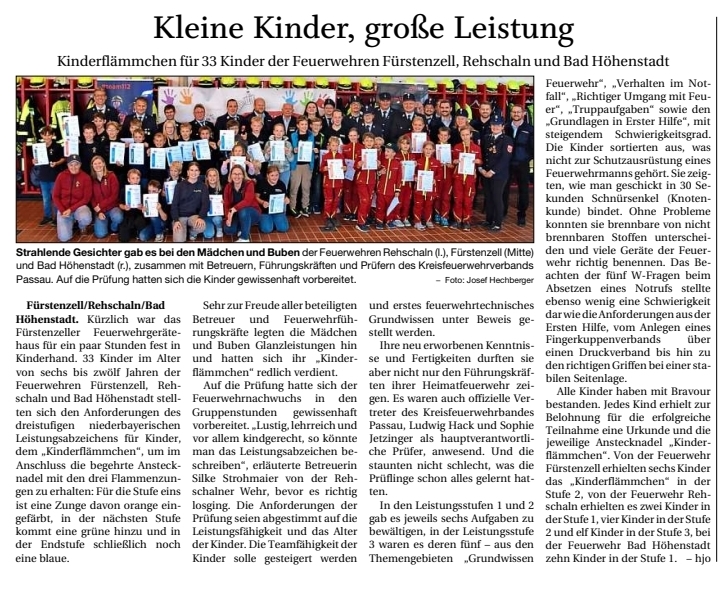Alle Kinder haben mit Bravour bestanden. Jedes Kind erhielt zur Belohnung für die erfolgreiche Teilnahme eine Urkunde und die jeweilige Anstecknadel „Kinderflämmchen“. Von der Feuerwehr Fürstenzell erhielten sechs Kinder das „Kinderflämmchen“ in der Stufe 2, von der Feuerwehr Rehschaln erhielten es zwei Kinder in der Stufe 1, vier Kinder in der Stufe 2 und elf Kinder in der Stufe 3, bei der Feuerwehr Bad Höhenstadt zehn Kinder in der Stufe 1.