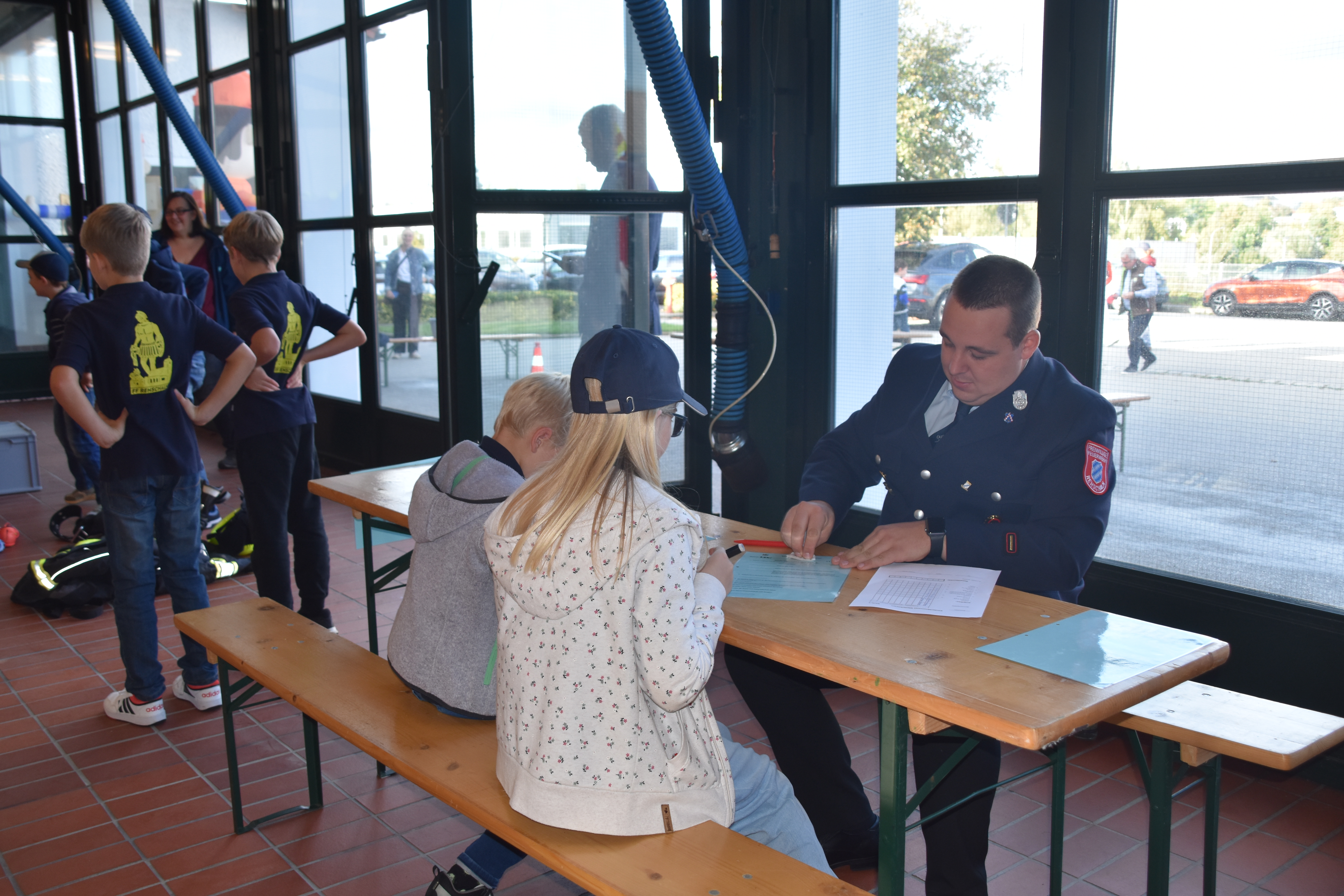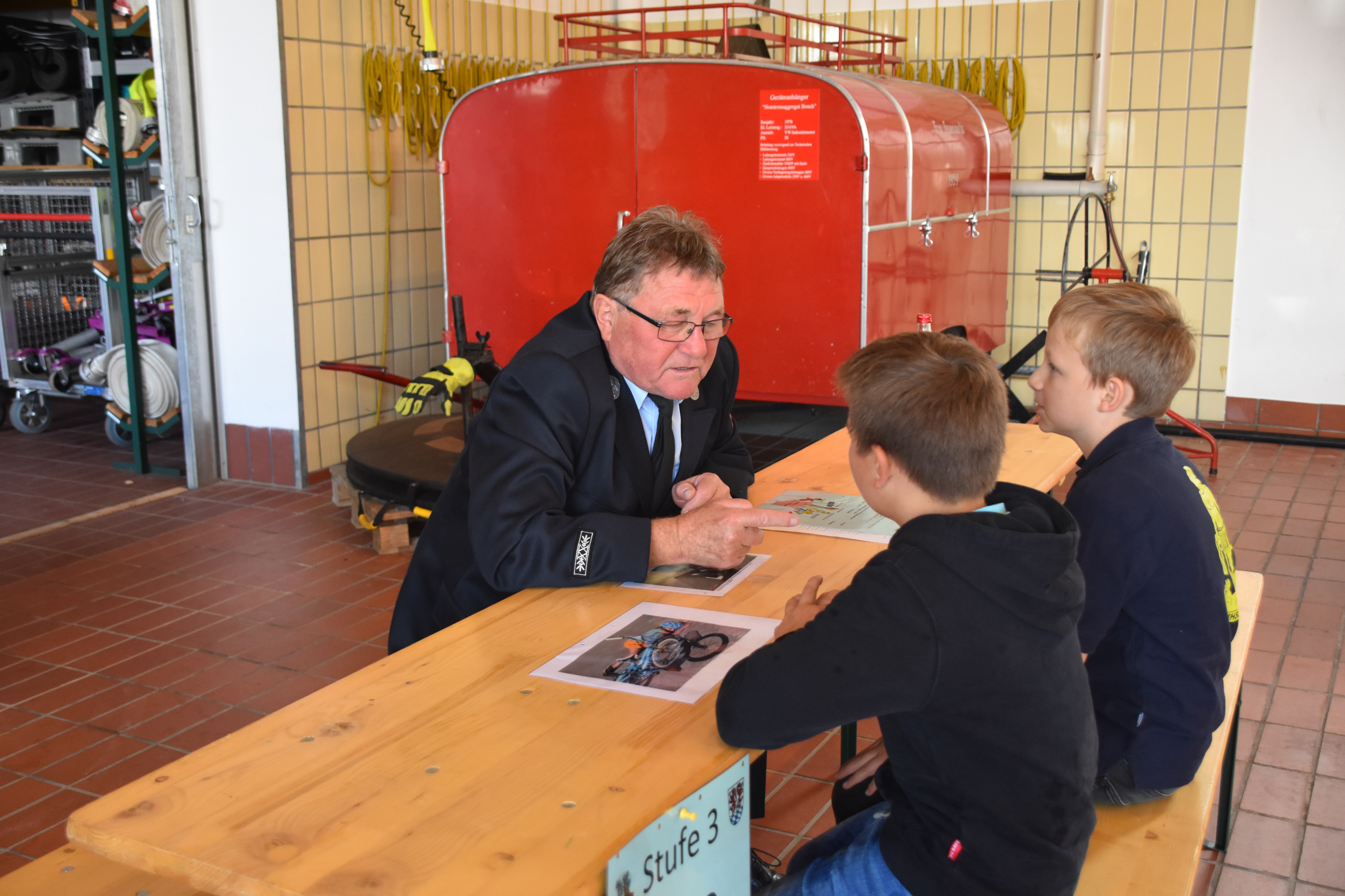 In den Leistungsstufen 1 und 2 gab es jeweils sechs Aufgaben zu bewältigen, in der Leistungsstufe 3 waren es deren fünf – aus den Themengebieten „Grundwissen Feuerwehr“, „Verhalten im Notfall“, „Richtiger Umgang mit Feuer“, „Truppaufgaben“ sowie den „Grundlagen in Erster Hilfe“, mit steigendem Schwierigkeitsgrad. Die Kinder sortierten aus, was nicht zur Schutzausrüstung eines Feuerwehrmanns gehört. Sie zeigten, wie man geschickt in 30 Sekunden Schnürsenkel (Knotenkunde) bindet. Ohne Probleme konnten sie brennbare von nicht brennbaren Stoffen unterscheiden und viele Geräte der Feuerwehr richtig benennen. Das Beachten der fünf W-Fragen beim Absetzen eines Notrufs stellte ebenso wenig eine Schwierigkeit dar wie die Anforderungen aus der Ersten Hilfe, vom Anlegen eines Fingerkuppenverbands über einen Druckverband bis hin zu den richtigen Griffen bei einer stabilen Seitenlage.